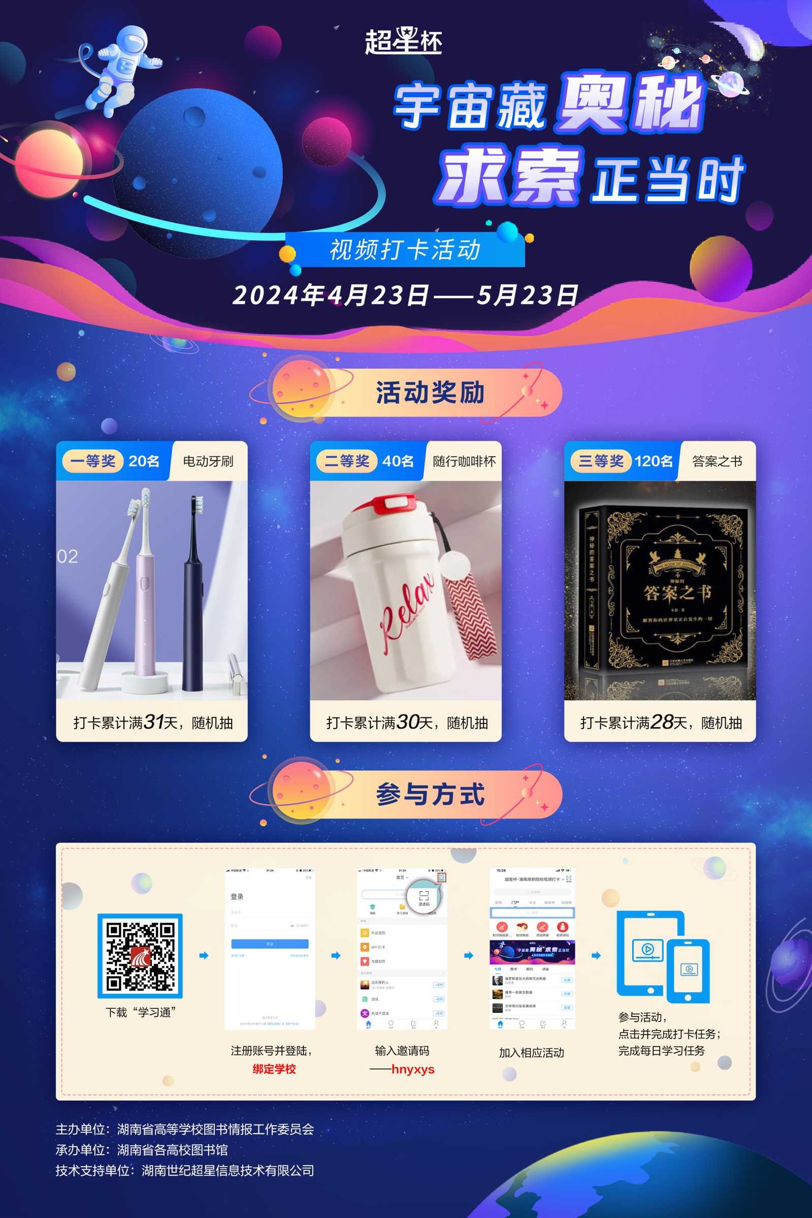 为深入贯彻落实习近平新时代中国特色社会主义思想、党的二十大和二十届二中全会精神,积极落实《全国青少年学生读书行动实施方案》和湖南省教育厅《关于做好2024年全省普通本科高校“一校一书——经典、精读、经世”阅读推广活动的通知》要求,大力营造爱读书、读好书、善读书的学习氛围,巩固壮大奋进新时代的主流思想舆论,激发团结奋进的强大力量,为全面建设社会主义现代化新湖南培养优秀人才。为此,湖南省高等学校图书情报工作委员会特联合湖南世纪超星信息技术有限公司举办湖南省普通高校图书馆阅读学习活动。