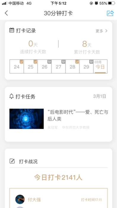 视频打卡活动:活动设馆员参与一、二、三等奖,师生参与一、二、三等奖,获奖者颁发奖品。所有参与单个打卡活动满 31 天者可以获得学习证明。