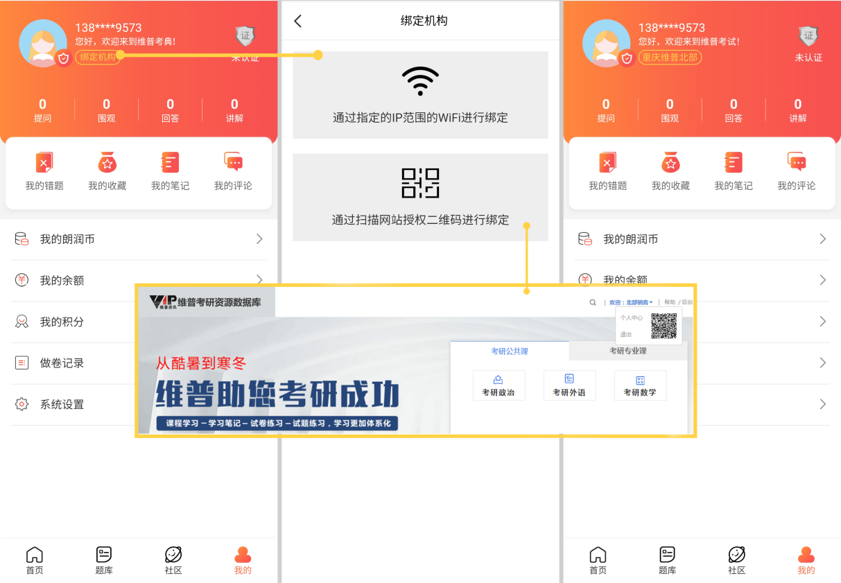 在校外注册的无机构权限的个人账号,可以通过“维普考试APP”登录连接校园网IP范围内的WIFI来绑定机构权限,或者通过APP扫描机构授权二维码(用户在校园网IP范围内打开产品官网,机构授权二维码会自动显示在首页右上角的机构名称下)来实现机构绑定;绑定了机构权限的个人账号可在校外登录使用产品的部分资源。