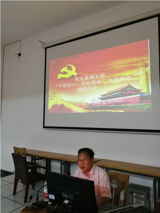 9月19日下午4点,第五直属党支部在图书馆A313室召开“不忘初心、牢记使命”主题教育动员大会,会议由党支部书记陈杏生同志主持。