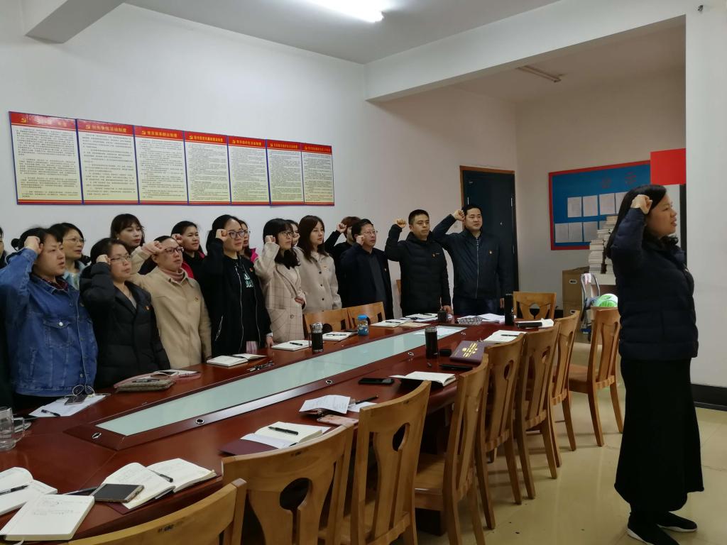 3月18日上午九点,第五直属党支部在图书馆B402党员活动室召开“戴党徽、亮身份、树标兵”主题党日活动。活动由支部书记陈杏生同志主持,全体党员整齐佩戴党徽,由组织委员吕素娟同志领誓,在党旗前重温入党誓词。