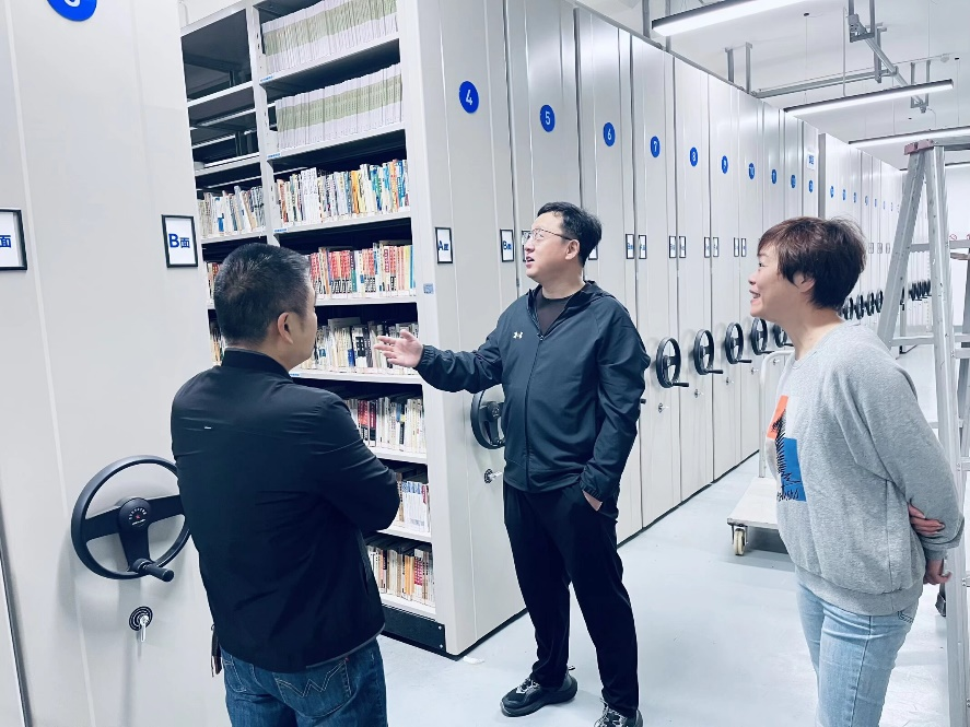 在密集书库,褚副校长详细询问了图书出版年代、借阅频次、内容时效性等情况,对图书馆在前期图书清点、分类筛查工作中所做的扎实努力给予了充分肯定。针对此次调研中的主要问题,褚副校长与陪同人员现场交流,共同探讨解决方案,并提出具体指导意见。